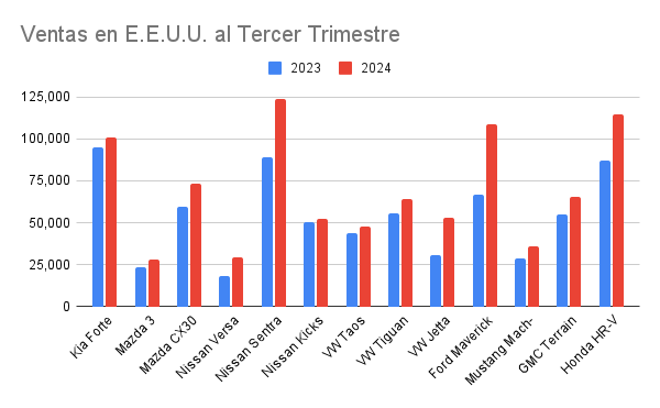 Entre estos modelos destaca un grupo de propuestas que ya superaron las 100 mil unidades vendidas en los primeros nueve meses del año. Se trata del Nissan Sentra, la Honda HR-V, la Ford Maverick y el Kia Forte.