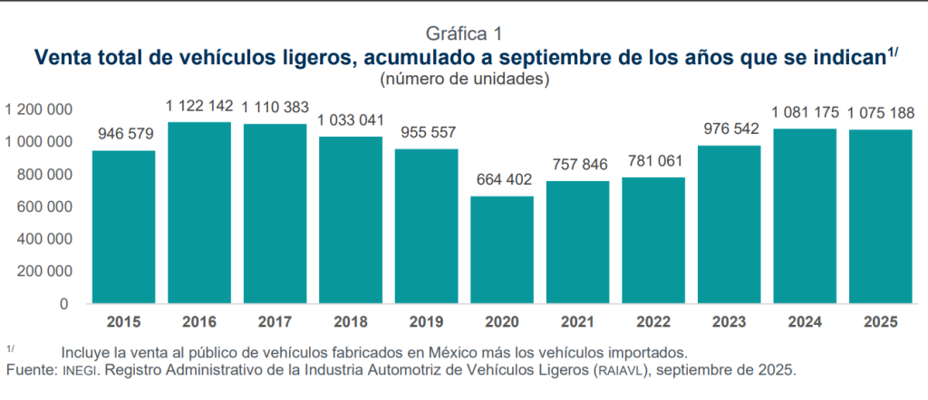 De acuerdo al Registro Administrativo de la Industria Automotriz de Vehículos Ligeros (RAIAVL), las ventas acumuladas de los primeros nueve meses suman ya un millón 75 mil 188 unidades, casi 6 mil automotores menos que en el mismo periodo del año año pasado, que equivale al -0.6%.