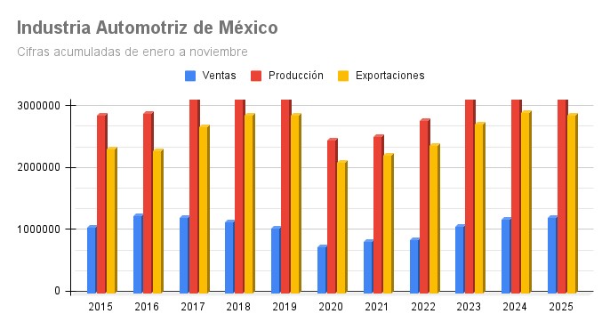 En cuanto al volumen acumulado en los primeros once meses del presente año, la cifra de producción se ubica en 3 millones 709 mil 533 vehículos ligeros, una diferencia negativa de 55 mil unidades, o bien -1.46%, respecto al mismo periodo del 2024.