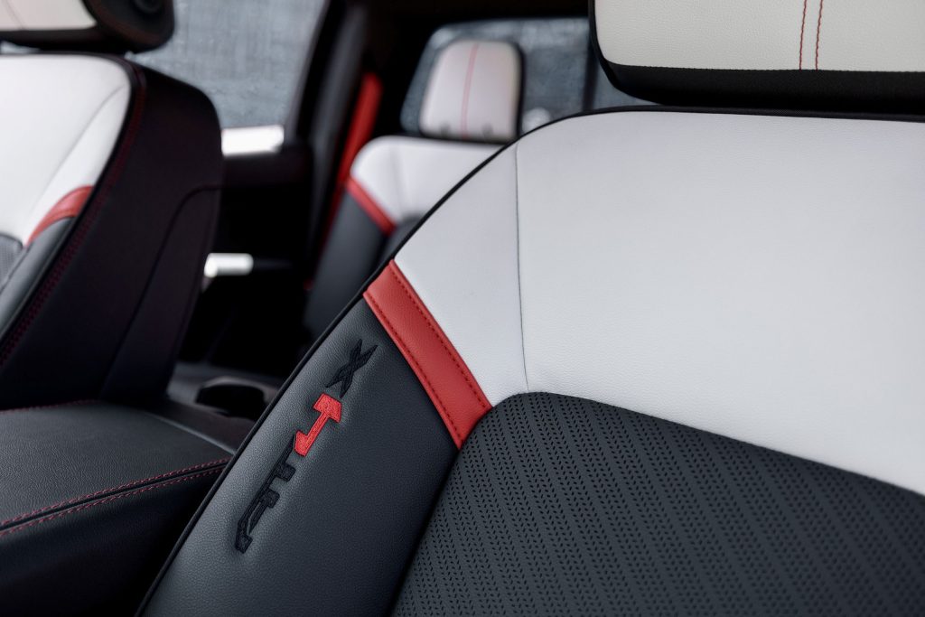 El interior cuenta con acabado Obsidian Rush, asientos de piel calefactables y ventilables, tapetes de vinil para todo tipo de clima y distintivos AT4X, aire acondicionado bizona con control automático y volante calefactable con controles de crucero y audio.