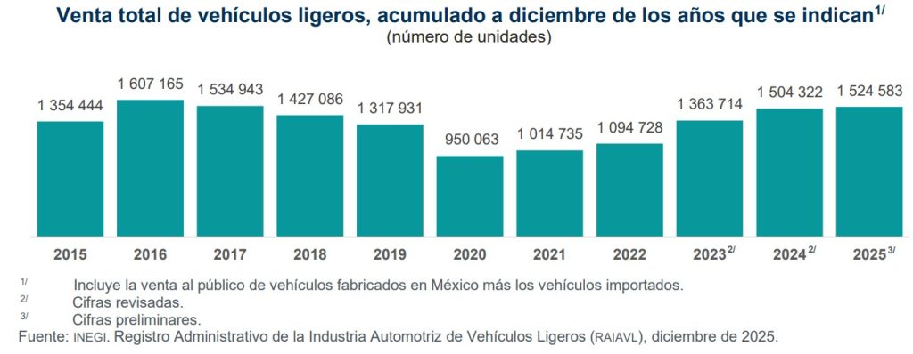 Con esta cifra, el total de ventas en el 2025 alcanzó las 1.52 millones de unidades, 20 mil vehículos más que el año anterior, que se traduce en un modesto aumento de 1.3%, según revelan los últimos datos del Inegi.