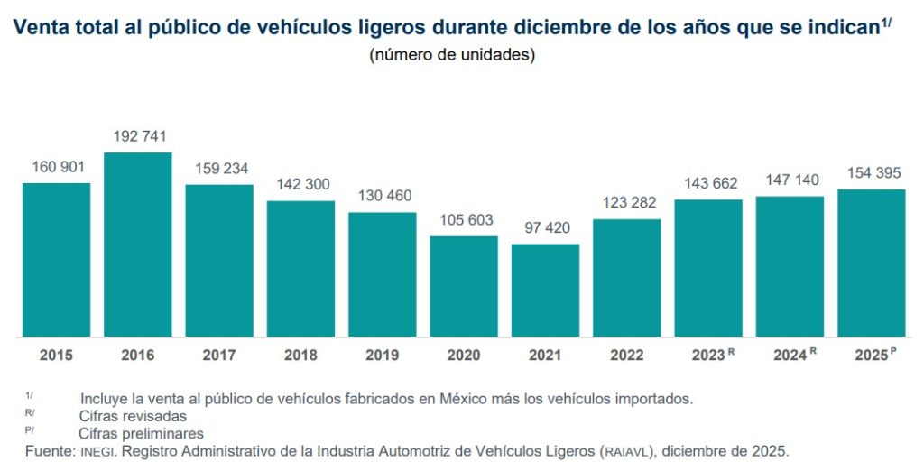 Las ventas de vehículos ligeros cero kilómetros tuvieron un sólido cierre de año en el mercado automotor mexicano con la comercialización de 154 mil 395 unidades durante diciembre pasado, volumen que supera en 4.9% al resultado del mismo mes del 2024.