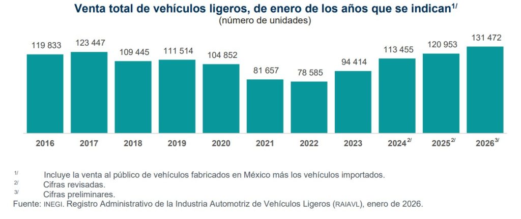 Concesionarios de autos nuevos establecidos en México comercializaron durante enero pasado el mayor volumen de vehículos ligeros para un arranque de año registrado a la fecha, con la entrega de 131 mil 472 unidades, resultado que supera en 8.7% al del inicio del 2025, de acuerdo al conteo oficial que realiza el Inegi.
