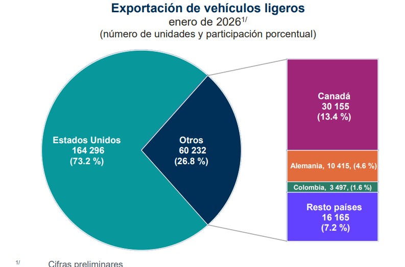 Las exportaciones, por el contrario, registraron un ligero incremento de 2.3% con la suma de 224 mil 528 vehículos, de los cuales el 73.2%, o bien 164 mil unidades, tuvieron como destino los Estados Unidos, lo que representa un declive de -10.4% respecto a los 183 mil automotores enviados al vecino país en enero del 2025.